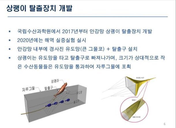 국내에서도 부수어획을 막기 위해 노력하고 있습니다. 주로 피해를 보는 동물은 상괭이로, 연 1천마리 정도가 부수 어획으로 잡혀 죽는 것으로 알려져 있습니다. 현재 국립수산원에서 상괭이 탈출용 그물을 개발해 시연해본 결과 효과가 뛰어났지만 어획량 감소를 우려한 어민들의 반대로 받아들여지지 않고 있습니다.