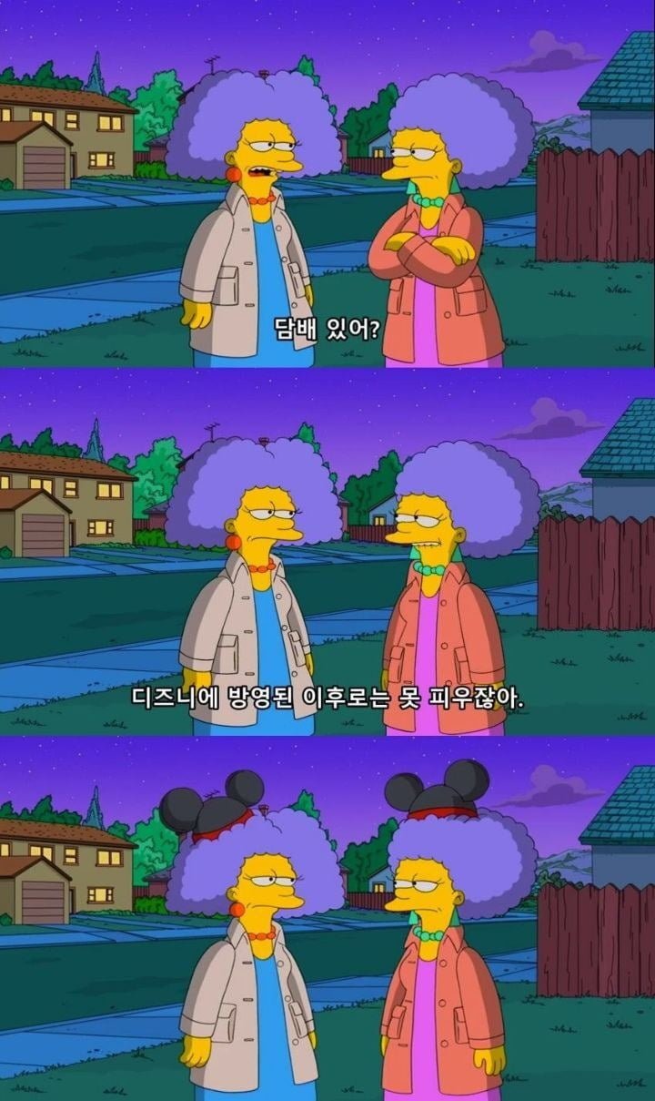 [스크랩] [기타]디즈니에 팔리고 난 후 심슨가족에 나온 장면 작성자쁘걸 김남홍이|작성시간21.11.16|조회수3,440 목록 댓글 1 글자크기 작게가 글자크기 크게가 출처 : 여성시대 오구리(깜찍)근데 저렇게 입만 털고 그 뒤에도 계속 핌심슨>>>>>디즈니+원래 심슨에서 디즈니 저작권 빡세서 약간의 언급만 있어도 바로 권리행사 들어온다는 식으로 비꼬곤 했었는데인수되자마자 온갖 디즈니 캐릭터 다 나오면서 이제 써도 된다고 하는 드립도 있었음 ㅋㅋ 다음검색 스크랩 원문 : *여성시대* 차분한 20대들의 알흠다운 공간 현재 게시글 추가 기능 열기 북마크 공유하기 신고 센터로 신고 댓글 댓글 1 댓글쓰기 답글쓰기 댓글 리스트 작성자명탐정호랑이 | 작성시간 21.11.16 심슨은 진짜 미친 것 같음 ㅋㅋㅋㅋ 댓글 전체보기