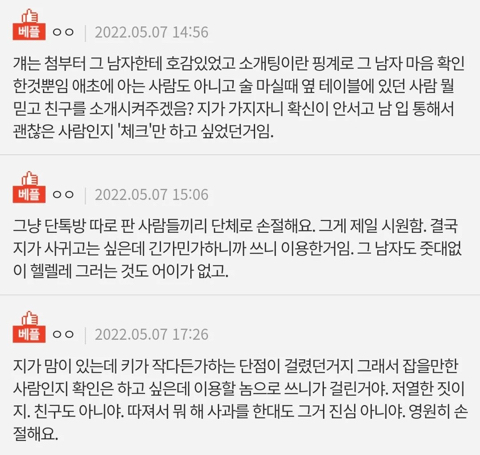 작성자인생탈출넘버원 작성시간 22.05.08 둘이 사귀게된것도 주선자가 쓰니 얘기하면서 남자한테 돌려깠을거라는거에 한표...진짜 저렇게 살고싶을까;