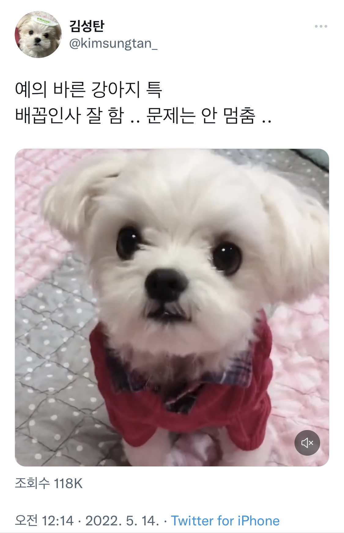 [스크랩] [동물]예의 바른 강아지 특.twt 작성자내일 지구가 망했으면 좋겠어|작성시간22.05.18|조회수3,260 목록 댓글 1 글자크기 작게가 글자크기 크게가 예의 바른 강아지 특 배꼽인사 잘 함 .. 문제는 안 멈춤 .. pic.twitter.com/u465ThBY6o— 김성탄 (@kimsungtan_) May 13, 2022 다음검색 스크랩 원문 : 밀리토리네 현재 게시글 추가 기능 열기 북마크 공유하기 신고 센터로 신고 댓글 댓글 1 댓글쓰기 답글쓰기 댓글 리스트 작성자인생탈출넘버원 | 작성시간 22.05.18 ㅋㅋㅋㅋ아이구 인사잘하네ㅋㅋ몇살이야? 까까 사먹게 용돈줄까?ㅋㅋ 댓글 전체보기