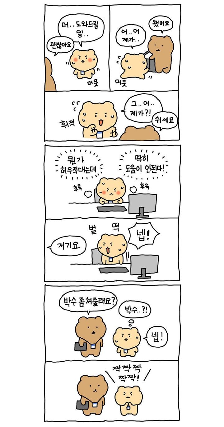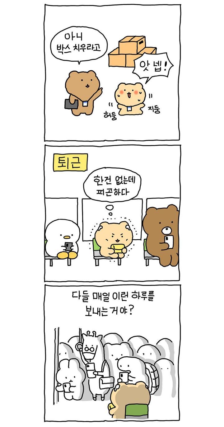 [스크랩] [기타](망그러진 만화) 신입사원 작성자내일 지구가 망했으면 좋겠어|작성시간22.05.27|조회수4,327 목록 댓글 8 글자크기 작게가 글자크기 크게가 출처 : https://twitter.com/yurang_official/status/1530025538047254529?t=2dtJTx1M74uPikqmhDR3og&s=19트위터에서 즐기는 망그러진 곰“직장인 화이팅🫠”twitter.com박수 좀 쳐줄래요? 다음검색 스크랩 원문 : *여성시대* 차분한 20대들의 알흠다운 공간 현재 게시글 추가 기능 열기 북마크 공유하기 신고 센터로 신고 댓글 댓글 8 댓글쓰기 답글쓰기 댓글 리스트 작성자펀쿨섹 | 작성시간 22.05.27 흐이이잉 할때 코에 방울 ㅋㅋㅋㅋㅋㅋㅋㅋㅋㅋㅋㅋㅋㅋㅋㅋㅋㅋㅋㅋㅋㅋㅋㅋ 작성자사탕맛캔디 | 작성시간 22.05.27 아휴 그림체 기엽네 ㅠㅠㅠ 작성자Ragnaros | 작성시간 22.05.27 그치 떵은 회사에서 싸야 떵싸면서 돈벌기 가능 ㅋㅋㅋㅋㅋㅋㅋ 작성자다시태어나면우주인이될꺼야 | 작성시간 22.05.27 ㅋㅋㅋㅋㅋㅋ 완전 공감되네 ㅋㅋㅋㅋ 작성자튜브20 | 작성시간 22.05.27 기여우엌ㅋㅋㅋㅋㅋㅋㅋㅋ웹툰도 그리시는구남 댓글 전체보기