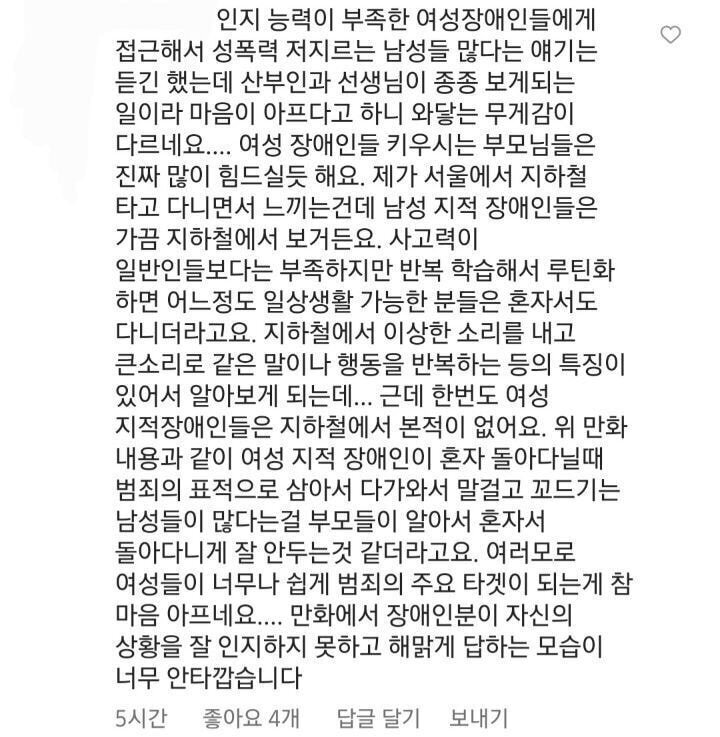 그렇다고 "무슨 지적 장애인이 성관계야? 그냥 살면되지"라고 말하는 건 진정한 장애인의 인권이 아닌거 같아서요. -