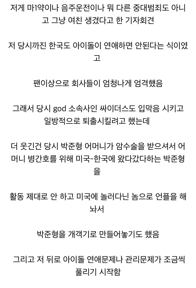 답댓글 작성자Smileㅋㅋ 작성시간 22.08.28 예전에 혹시 박재범은 왜 탈퇴 당했는지(?) 아시는 분 있으세요? 그때도 뭐 박진영이 기사내기로는 절대로 공인으로는 해서는 안될행동을 했기에 퇴출했다 이런식으로 인터뷰했던거 같은데 그때 어려서 잘 기억이 안나긴하지만. . 근데 지금의 박재범으로 봐서는 그렇게 큰일도 아닐것같다라는 생각이..