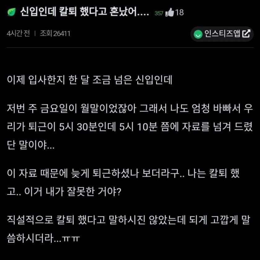 작성자정콩이 작성시간 23.07.18 애초에 신입한테 일맞기면 몇시까지 주세요 하지 않나? 완~젼 신입이라는 전재하에 그 자료 받아서 바로 쓰지도 못할거고 수정사항 말하고 왔다갔다 몇번은 해야될텐댕..