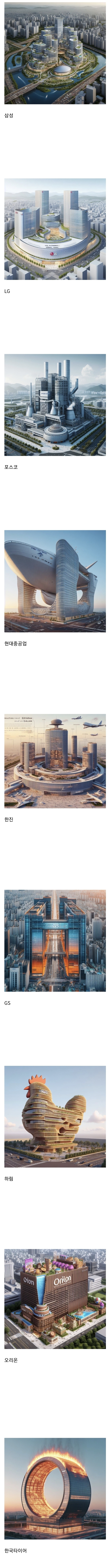 [기타]AI가 새로 구현한 국내 주요 대기업들의 본사 사옥.jpg 작성자내일 지구가 망했으면 좋겠어|작성시간23.10.15|조회수2,461 목록 댓글 7 글자크기 작게가 글자크기 크게가 엽기 혹은 진실(세상 모든 즐거움이 모이는곳)출처 : 더쿠 다음검색 현재 게시글 추가 기능 열기 북마크 공유하기 신고 센터로 신고 댓글 댓글 7 댓글쓰기 답글쓰기 댓글 리스트 답댓글 작성자황초롱이 | 작성시간 23.10.15 22ㅋㅋㅋ 작성자박 보 검. | 작성시간 23.10.15 하림ㅋㅋㅋㅋ 작성자홈런진행중 | 작성시간 23.10.15 한국타이어 뭐얔ㅋㅋㅋㅋㅋㅋ 작성자충언을 올리는 간신 | 작성시간 23.10.15 한진을 두 개의 큰 원형 구조로 표현한건 수갑을 모티브로 한건가 봅니다. 갑질과 범죄를 너무 많이 저질러서.... 작성자호빵찐빵 | 작성시간 23.10.19 한국타이어랑 하림때문에 다 잊어버렸넼ㅋㅋㅋ 댓글 전체보기