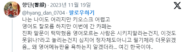 [스크랩] [분노]어제자 카페 갔다가 여기가 한국 맞냐며 트위터에 올린 사람 ㄷㄷㄷ..JPG 작성자황초롱이|작성시간23.11.20|조회수8,836 목록 댓글 47 글자크기 작게가 글자크기 크게가 다음검색 스크랩 원문 : 도탁스 (DOTAX) 현재 게시글 추가 기능 열기 북마크 공유하기 신고 센터로 신고 댓글 댓글 47 댓글쓰기 답글쓰기 댓글 리스트 삭제된 댓글입니다. 답댓글 작성자에헤이~ | 작성시간 23.11.21 황치즈 웃기려고 그런 거면 성공이네요ㅋㅋ 작성자BillKaulitz | 작성시간 23.11.21 주문 한국말로 하면 뒤진다진짜 개꼴갑이네 작성자시백 | 작성시간 23.11.22 죄다 영어인데 1인 1음료는 한국말로 써놨네 ㅋㅋㅋㅋ진짜 ㅇㅂ~ 작성자밀짚모자 루피 | 작성시간 23.11.22 대체 왜 저래..영어로 주문하면 못알아들을 거면서.. 댓글 전체보기