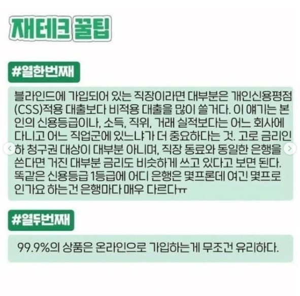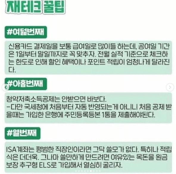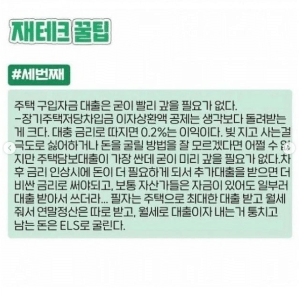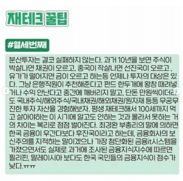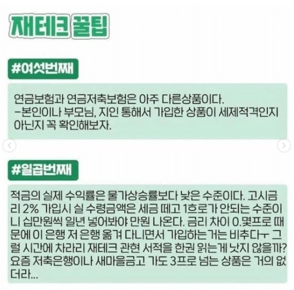 [스크랩] [기타]현직 8년차 은행원이 정리한 재테크 비법 작성자황초롱이|작성시간24.01.04|조회수3,599 목록 댓글 6 글자크기 작게가 글자크기 크게가 출처 :https://m.cafe.daum.net/ssaumjil/LnOm/2646592?svc=daumapp&bucket=toros_cafe_channel_alpha 다음검색 스크랩 원문 : *여성시대* 차분한 20대들의 알흠다운 공간 현재 게시글 추가 기능 열기 북마크 공유하기 신고 센터로 신고 댓글 댓글 6 댓글쓰기 답글쓰기 댓글 리스트 작성자초음파발사돌고래 | 작성시간 24.01.04 재테크 꿀팁 작성자돈모으는백수 | 작성시간 24.01.05 꿀팁 저장 작성자프로방해꾼 | 작성시간 24.01.05 우왕 감사합니당 작성자새하마노 | 작성시간 24.01.05 꿀팁저장 작성자라고 모쏠이 말했다. | 작성시간 24.01.06 꿀팁 댓글 전체보기