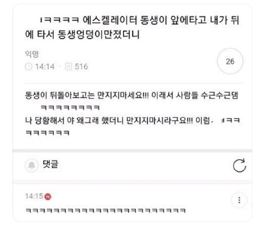 [유머]성추행범 된 썰 작성자고양이|작성시간24.01.04|조회수3,730 목록 댓글 3 글자크기 작게가 글자크기 크게가 엽기 혹은 진실(세상 모든 즐거움이 모이는곳)출처 : 인스타 다음검색 현재 게시글 추가 기능 열기 북마크 공유하기 신고 센터로 신고 댓글 댓글 3 댓글쓰기 답글쓰기 댓글 리스트 작성자초코덕후 | 작성시간 24.01.04 야가 아니라 자기야라고 했어야지 ㅋㅋㅋㅋ 작성자삶지 | 작성시간 24.01.05 가해자의 진술 잘 들었습니다. 작성자후안 룰포 | 작성시간 24.01.07 동생이라도 엉덩이 만지는 건 이상한데... 댓글 전체보기