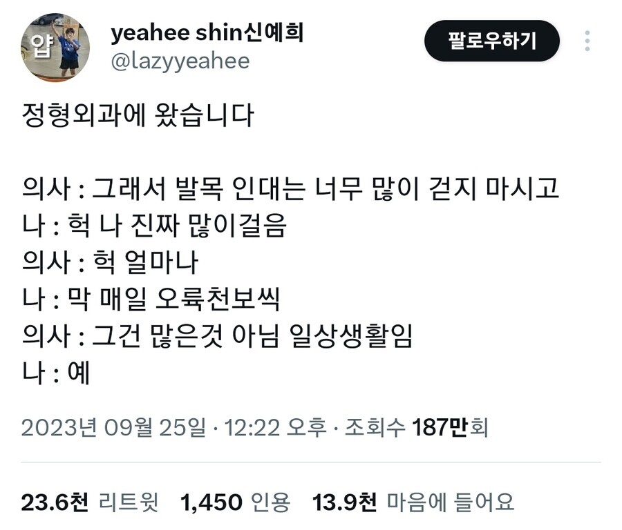 [기타]정형외과 : 많이 걷지 마세요. 작성자아랑수호가|작성시간24.01.05|조회수3,500 목록 댓글 4 글자크기 작게가 글자크기 크게가 엽기 혹은 진실(세상 모든 즐거움이 모이는곳)출처 : ㅌㅇㅌ 다음검색 현재 게시글 추가 기능 열기 북마크 공유하기 신고 센터로 신고 댓글 댓글 4 댓글쓰기 답글쓰기 댓글 리스트 작성자소나무아미타불관세음보살 | 작성시간 24.01.05 아하 나는 너무 안 걸어서 그래 작성자건포도빵 | 작성시간 24.01.05 저는 5천보 이하일때도 꽤 되는데 흠 작성자4년산 모코코 | 작성시간 24.01.06 ㅋㅋㅋㅋㅋㅋㅋㅋㅋㅋㅋㅋㅋㅋㅋㅋㅋㅋㅋㅋㅋ 작성자환혼윤정 | 작성시간 24.01.07 나한테는 제발 좀 걸으라고 하시겠지... 댓글 전체보기