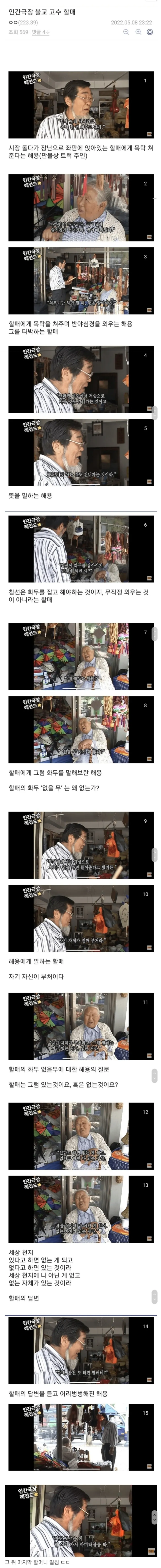 [기타]인간극장 불교 고수 할매 작성자초록푸른|작성시간24.05.13|조회수1,889 목록 댓글 5 글자크기 작게가 글자크기 크게가 엽기 혹은 진실(세상 모든 즐거움이 모이는곳)출처 : https://humoruniv.com/pds1306430 다음검색 현재 게시글 추가 기능 열기 북마크 공유하기 신고 센터로 신고 댓글 댓글 5 댓글쓰기 답글쓰기 댓글 리스트 작성자무시하지말라능 | 작성시간 24.05.13 와우ㄷㄷㄷㄷ 작성자광어우럭연어참치육회해산물곱창 | 작성시간 24.05.13 뭔가 멋지다 작성자행인1 | 작성시간 24.05.13 할매 견성 하셨네 작성자취미_댓글달기 | 작성시간 24.05.13 나 불교 너무 좋아ㅠㅠ 작성자호빵찐빵 | 작성시간 24.05.14 할매.. 열반 경지 댓글 전체보기