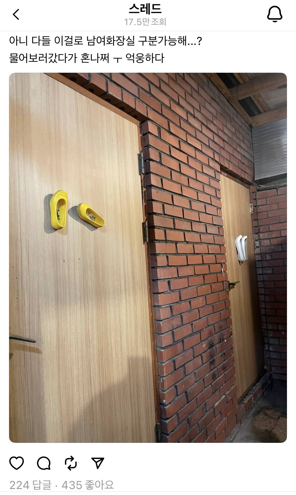 [스크랩] [기타]아니 다들 이걸로 남여화장실 구분가능해...? 작성자아랑수호가|작성시간24.06.11|조회수7,959 목록 댓글 21 글자크기 작게가 글자크기 크게가 출처: 여성시대 설리야멀쩡한 표시 냅두고 왜저러는데 다음검색 스크랩 원문 : *여성시대* 차분한 20대들의 알흠다운 공간 현재 게시글 추가 기능 열기 북마크 공유하기 신고 센터로 신고 댓글 댓글 21 댓글쓰기 답글쓰기 댓글 리스트 작성자초콜릿우체국 | 작성시간 24.06.11 좀 더 인식하기 좋게 해놔 ㅠㅠ 작성자불면증걸린고양이 | 작성시간 24.06.11 어캐 구분함????????????????????????????????? 작성자에헤이~ | 작성시간 24.06.12 저래놓은 것도 어이없는데 혼낸 게 더 어이없네 작성자으라하하하 | 작성시간 24.06.12 짚신/꽃신 요래 해놓으면 좋았을듯 작성자개풀뜨더먹네 | 작성시간 24.06.12 뭐야 거참 댓글 전체보기