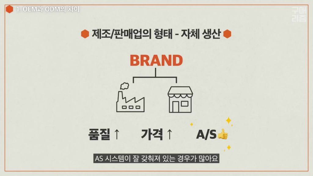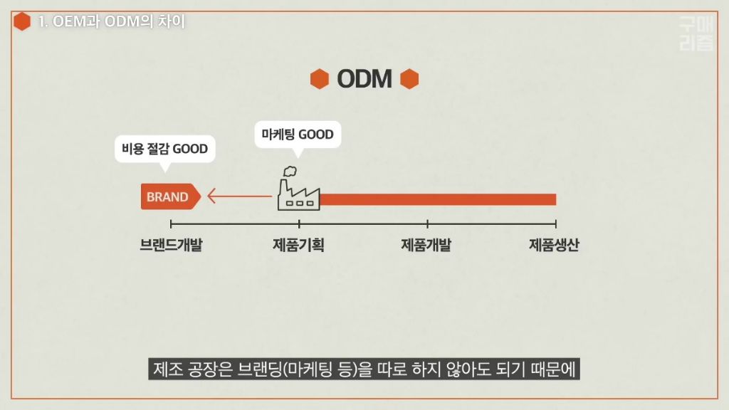2. ODM : 주문자 개발 생산, 업체가 브랜드 개발, 마케팅만 하고 공장에서 제품 기획, 개발, 생산을 다 하는 방식 (ex. 중소형 브랜드)