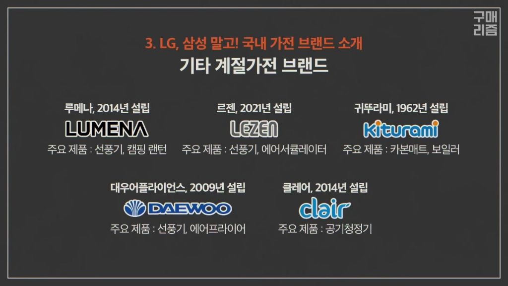 이 외 계절가전 국내 브랜드 = 루메나, 르젠, 귀뚜라미, 대우어플라이언스, 클레어
