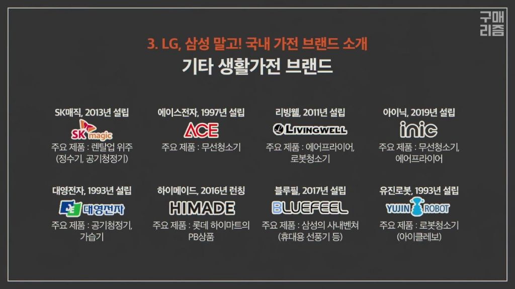 이 외 생활 가전 브랜드 : SK매직, 에이스전자, 리빙웰, 아이닉, 대영전자, 하이메이드, 블루필, 유진로봇