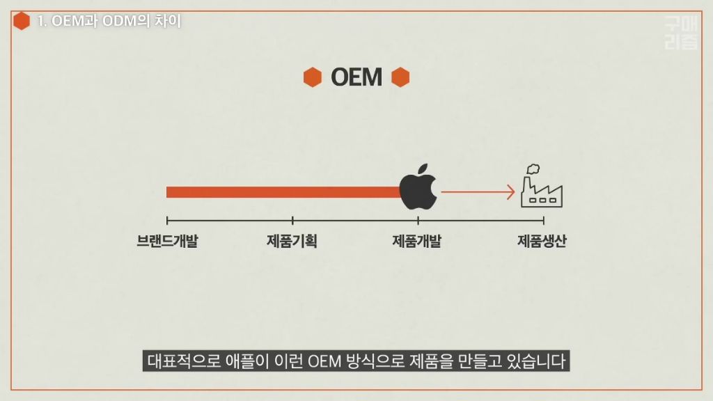 1. OEM : 주문자 상표 부착 생산, 업체가 브랜드 개발, 기획, 개발 다 하고 제품만 공장에 의뢰 하는 방식 (ex. 애플)