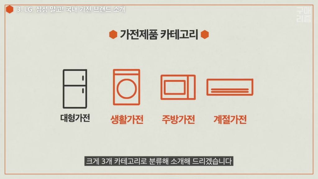 크게 생활가전/주방가전/계절가전으로 나뉨