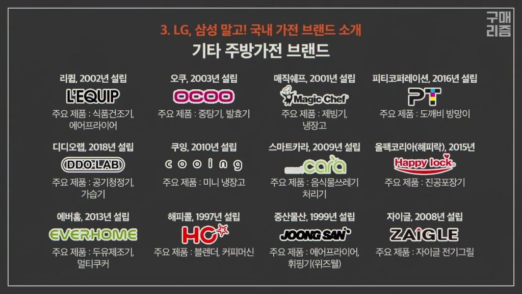 이 외 주방 가전 브랜드 : 리큅, 오쿠, 매직쉐프, 피티코퍼레이션, 디디오랩, 쿠잉, 스마트카라, 해피락, 에버홈, 해피콜, 중산물산, 자이글