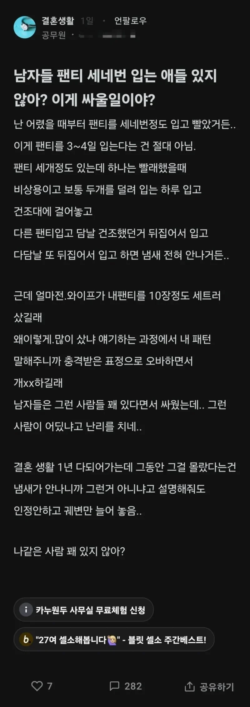 [기타]아내가 팬티 10장 세트를 사서 화난 남편 작성자아랑수호|작성시간24.09.25|조회수3,895 목록 댓글 56 글자크기 작게가 글자크기 크게가 엽기 혹은 진실(세상 모든 즐거움이 모이는곳)출처 : https://theqoo.net/square/3417432461 미역도 아니고 입었던 팬티를 자연 건조 한다고?? 다음검색 현재 게시글 추가 기능 열기 북마크 공유하기 신고 센터로 신고 댓글 댓글 56 댓글쓰기 답글쓰기 댓글 리스트 답댓글 작성자황초롱이 | 작성시간 24.09.26 222ㅋ 작성자광어우럭연어참치육회해산물곱창 | 작성시간 24.09.26 우웩........... 작성자살아라 | 작성시간 24.09.27 진짜 진심 저 글 읽고 속이 뒤집어 졌음... 저런 남자랑 사는 와이프가 넘 불쌍함...저런 드런 인간이랑 작성자맨얼굴테러 | 작성시간 24.09.27 혼란하다 혼란해….. 와이프 가엾다ㅠㅠㅠㅠㅠㅠㅠㅠㅠㅠ 작성자넷러너 | 작성시간 24.09.28 똥내나는 아재들 간혹 있는데 저런거 였군요...... 댓글 전체보기