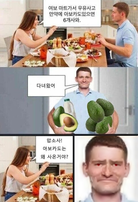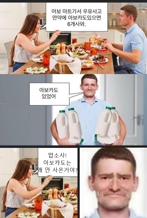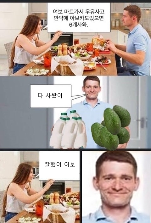 [스크랩] [유머]여보 마트가서 우유사고 만약에 아보카도 있으면 6개 사와.jpg 작성자네제가바로한화팬입니다|작성시간24.12.17|조회수16,047 목록 댓글 10 글자크기 작게가 글자크기 크게가 다음검색 스크랩 원문 : 도탁스 (DOTAX) 현재 게시글 추가 기능 열기 북마크 공유하기 신고 센터로 신고 댓글 댓글 10 댓글쓰기 답글쓰기 댓글 리스트 작성자승희님 | 작성시간 24.12.18 1로 듣는 사람이 없으니까 저 자체가 개그였던 건데 노잼 밈을 만드네 ㅋ 작성자산하 | 작성시간 24.12.17 무엇을 하든 혼 나는게 먼저라는 이야기지요 작성자이웃집 토토로 | 작성시간 24.12.17 2같은데 작성자★풀잎사랑★ | 작성시간 24.12.17 2번아닌가? 작성자재-쥬래갠 | 작성시간 24.12.17 2번이 정답이 아니야? 댓글 전체보기