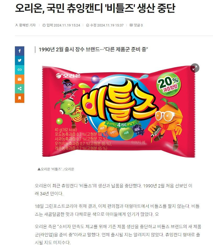 [기타]오리온, 국민 츄잉캔디 '비틀즈' 생산 중단 작성자카더|작성시간24.12.31|조회수2,248 목록 댓글 8 글자크기 작게가 글자크기 크게가 엽기 혹은 진실(세상 모든 즐거움이 모이는곳)출처 : ㄷㅋ https://www.greenpostkorea.co.kr/news/articleView.html?idxno=222008 다음검색 현재 게시글 추가 기능 열기 북마크 공유하기 신고 센터로 신고 댓글 댓글 8 댓글쓰기 답글쓰기 댓글 리스트 작성자당근당근 당근 | 작성시간 24.12.31 아니 왜요ㅜㅜㅜㅜㅜ 작성자불법체류자얌 | 작성시간 24.12.31 추억의과자 작성자좀비75 | 작성시간 24.12.31 비틀즈....... Let it be..... 작성자좋은게좋은건가? | 작성시간 24.12.31 아 맛있는데.... 작성자잉어킹 | 작성시간 25.01.01 ㅜㅜ 설마 새콤달콤도 단종될려나 댓글 전체보기