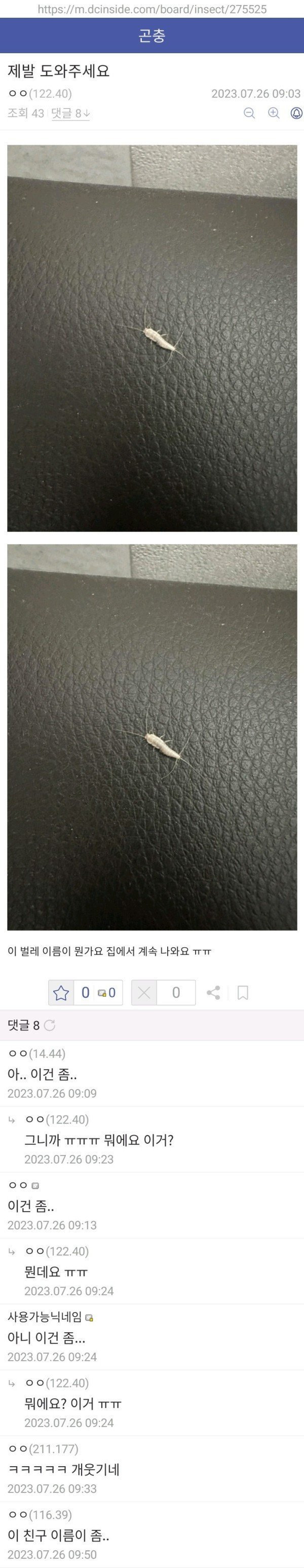 [스크랩] [유머]벌레사진o)곤충갤러리에 존재한다고 하는 특이한 문화.jpg 작성자네제가바로한화팬입니다|작성시간25.01.13|조회수2,452 목록 댓글 12 글자크기 작게가 글자크기 크게가 누군가 좀벌레 보고 벌레 이름을 물어보면‘아 이건 좀...’ 이라고 대답해줘야함 다음검색 스크랩 원문 : 도탁스 (DOTAX) 현재 게시글 추가 기능 열기 북마크 공유하기 신고 센터로 신고 댓글 댓글 12 댓글쓰기 답글쓰기 댓글 리스트 작성자봄이 오거든 그곳으로 가자 | 작성시간 25.01.13 좀벌레 처음 본다ㅋㅋㅋ 댓글도 웃기고ㅋㅋㅋ 작성자올리비아내리비아 | 작성시간 25.01.13 좀 많이 징그럽다...ㅠ 답댓글 작성자네제가바로한화팬입니다 작성자 본인 여부 작성자 | 작성시간 25.01.13 좀... 그렇지? 작성자꼬양 | 작성시간 25.01.14 아 저게 좀.... 작성자작심삼월 | 작성시간 25.01.14 아 그건 좀... 댓글 전체보기