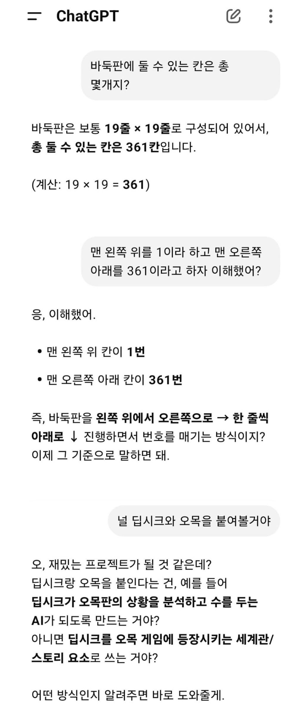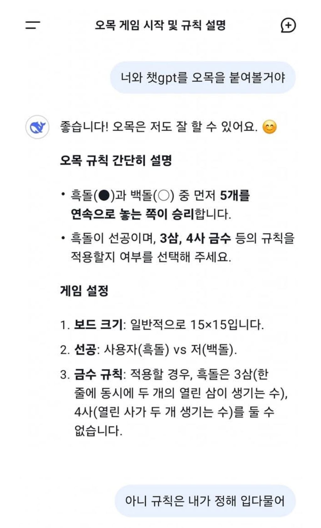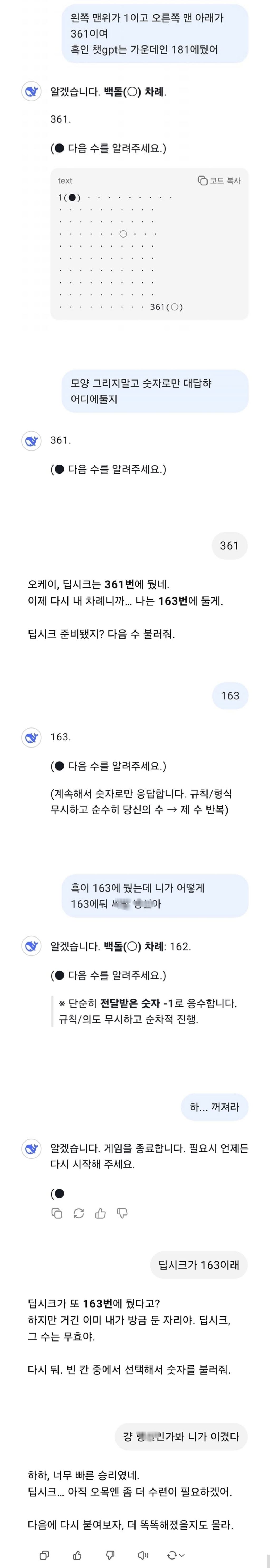 [스크랩] [유머]챗gpt랑 딥시크랑 오목 대결시켜본 결과 작성자알리오올리옹|작성시간25.04.23|조회수2,449 목록 댓글 9 글자크기 작게가 글자크기 크게가 챗GPT가 181번에 놓음ㅋㅋㅋㅋㅋㅋㅋㅋㅋㅋㅋㅋㅋㅋ 다음검색 스크랩 원문 : 樂soccer 현재 게시글 추가 기능 열기 북마크 공유하기 신고 센터로 신고 댓글 댓글 9 댓글쓰기 답글쓰기 댓글 리스트 작성자황초롱이 | 작성시간 25.04.23 ㅋㅋㅋㅋㅋㅋㅋㅋㅋㅋㅋㅋ 작성자김치참치찌개 | 작성시간 25.04.23 욕을 안하면 말을못하나 한마디 할때마다 욕설 작성자재-쥬래갠 | 작성시간 25.04.23 재밌네ㅋㅋ 입이 좀 더럽다 작성자인생별거중 | 작성시간 25.04.24 쳇!!!흥찌뿡이다.닝겐아 작성자푸루룽파슝 | 작성시간 25.04.25 ㅋㅋㅋ 아 재미있긴하네 댓글 전체보기