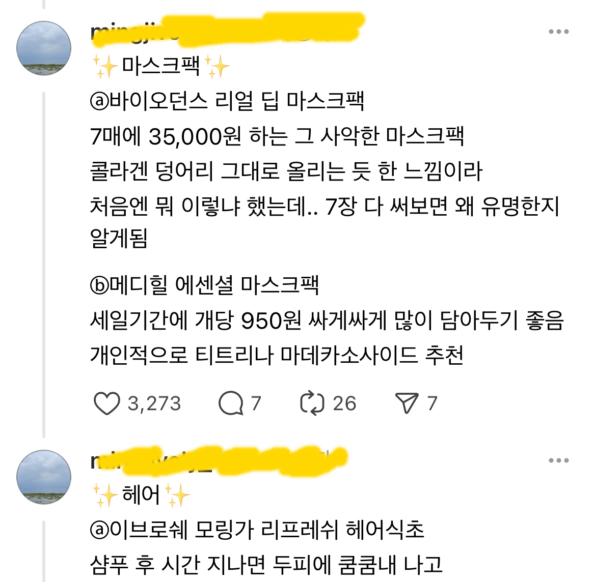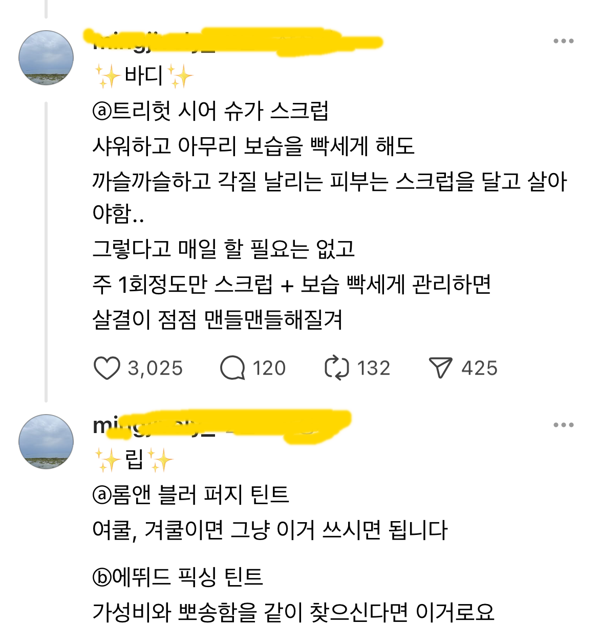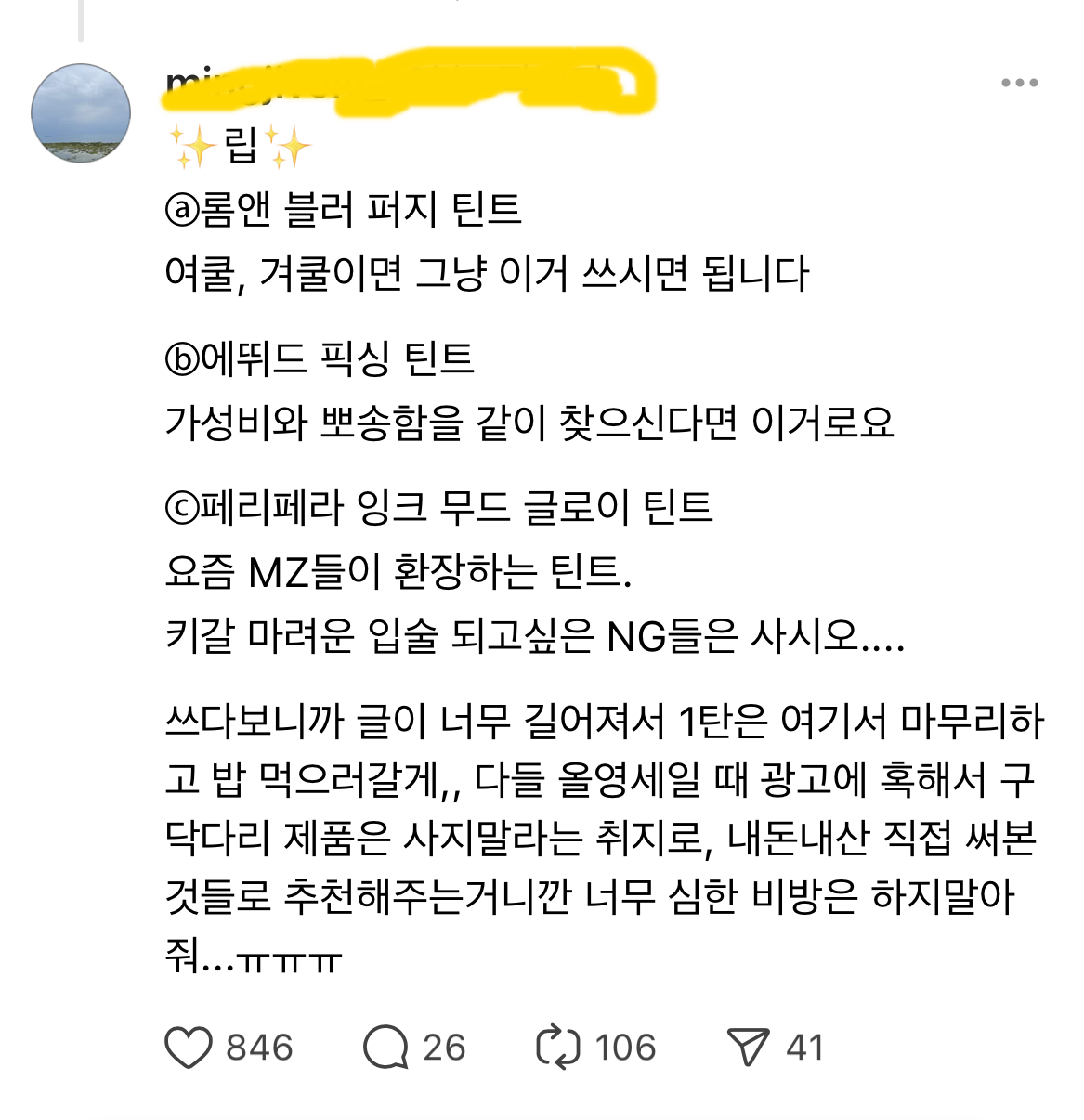 [스크랩] [기타]올리브영에 170만원 쓴 사람의 꿀템리스트+꿀팁 3개.jpg 작성자푸루룽파슝|작성시간25.06.02|조회수2,259 목록 댓글 2 글자크기 작게가 글자크기 크게가 젤위에 팁 3개가 ㄹㅇ꿀인듯 재고확인,비추템 메모메모... 이번 올영세일 괜찮다해서 개큰쇼핑갈예정이라 공유해본다 다음검색 스크랩 원문 : 쭉빵카페 현재 게시글 추가 기능 열기 북마크 공유하기 신고 센터로 신고 댓글 댓글 2 댓글쓰기 답글쓰기 댓글 리스트 작성자무플방지위원회장 | 작성시간 25.06.03 바이럴인가뵈 작성자인뿌피 | 작성시간 25.06.04 흠….. 올영 직원인 내가 봤을 땐 역시 사바사군 댓글 전체보기