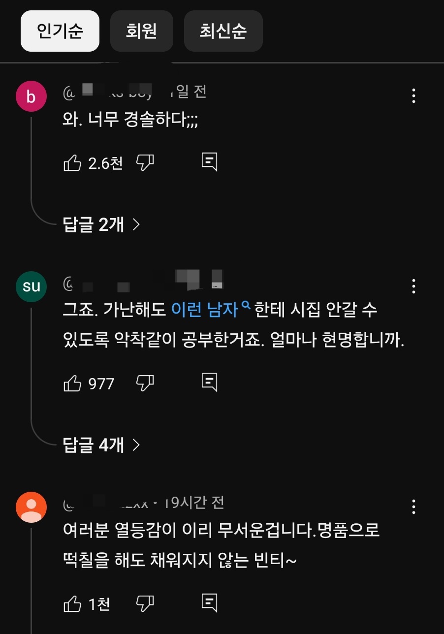 유튜버 : 아 그래서 시청자들이 질투하는 사람이 많았을지도? 아무래도 시청자중에는 힘들게 사시는 분들이 많으니까. 정숙조차도 이제 아니꼬워보일 수 있죠. 왜냐면 BMW도 있고 변호사까지 됐으니까