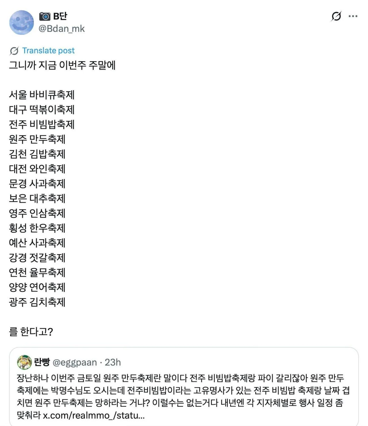 작성자안녕쌉싸리와dy 작성시간 25.10.23 지금은 모르겠는데 몇년전에 어디자료봤는데 1년에 한국에서 진행하는 지역축제가 토탈 500개 정도 된다고 본듯 ㅋㅋㅋㅋ 가만생각해보면 우리 고향동네도 엄청 시골깡촌인데 내가 아는것만 1년에 4~5개 정도 축제 하는걸로 아는데 그렇게 보면 전국에서 1년에 500개정도 하는게 무리는 아닐듯.ㅋㅋ