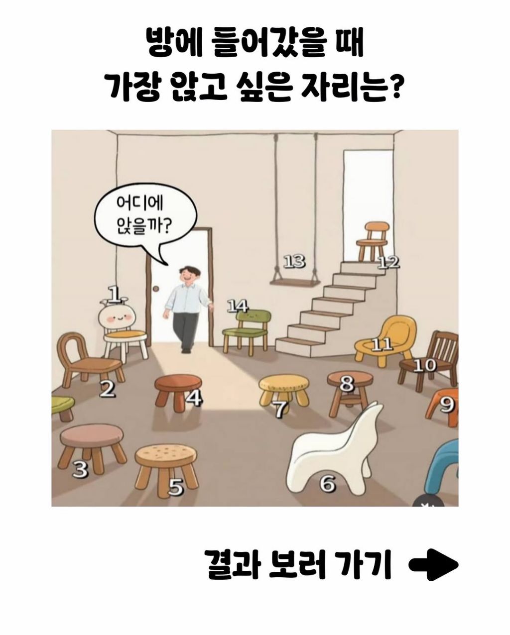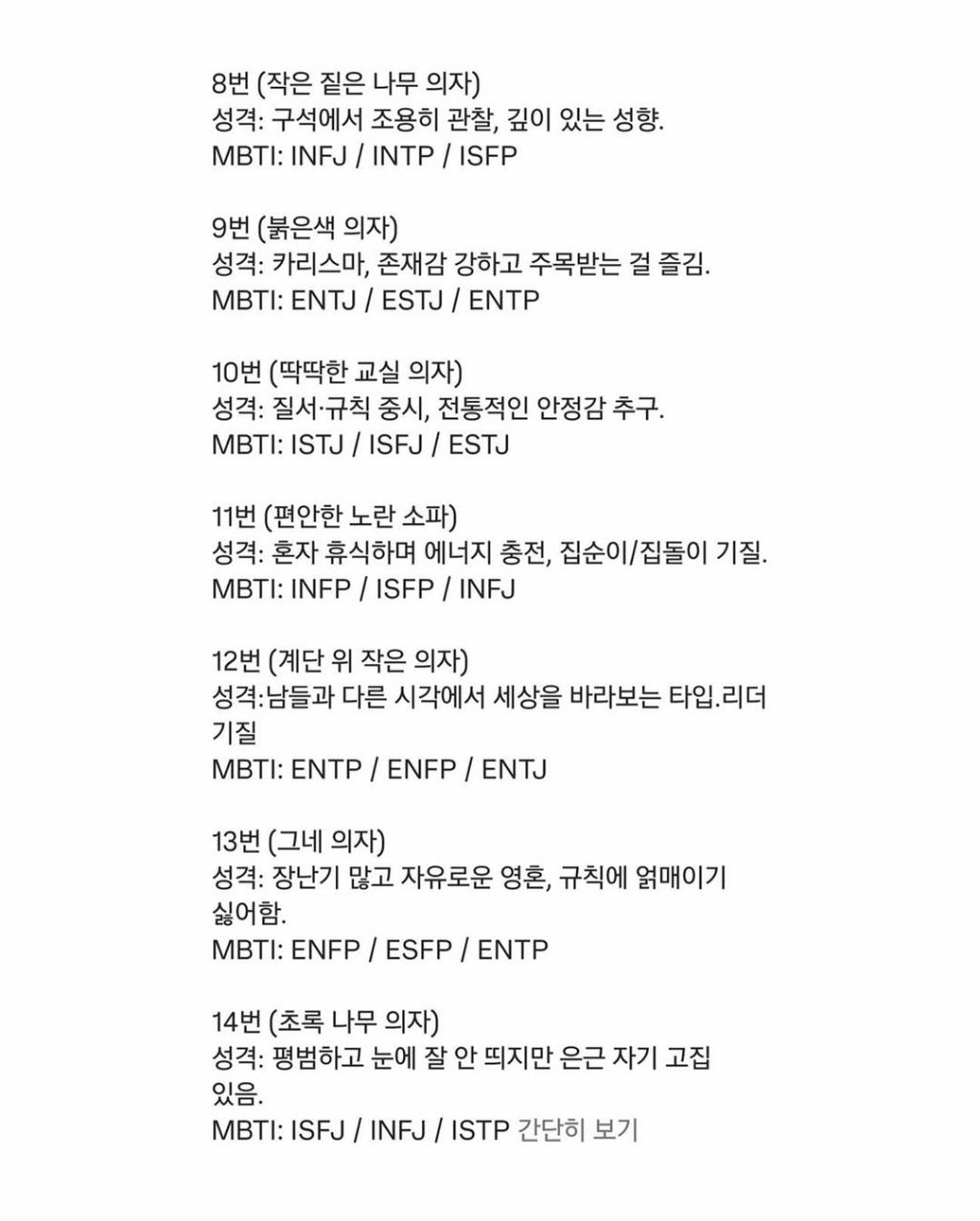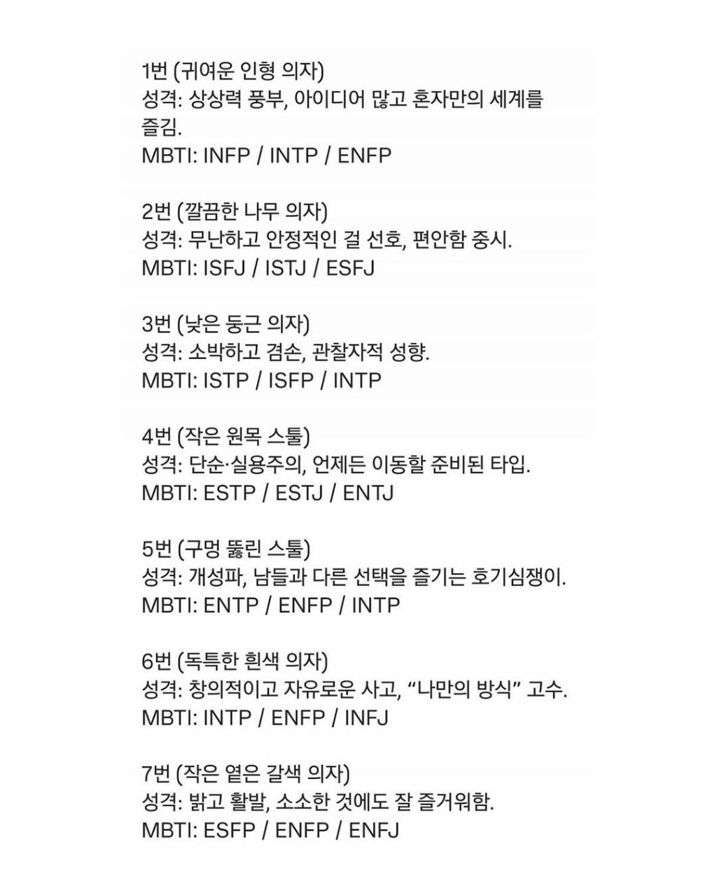 [유머]가장 앉고 싶은 의자로 보는 mbti 테스트.jpg 작성자초아요♥|작성시간25.10.24|조회수7,257 목록 댓글 37 글자크기 작게가 글자크기 크게가 엽기 혹은 진실(세상 모든 즐거움이 모이는곳)출처 : 인스타그램 다음검색 현재 게시글 추가 기능 열기 북마크 공유하기 신고 센터로 신고 댓글 댓글 37 댓글쓰기 답글쓰기 댓글 리스트 작성자BTS 김석진 | 작성시간 25.10.26 저 INTP인데 바로 11번 고른.. 작성자술시묘 | 작성시간 25.10.27 11인팁, 기댈곳있는 구석진자리가 최애임 작성자하하더라앙 | 작성시간 25.10.27 13번 ㅋㅋㅋ 어캐맞췄어 작성자뭣이라 | 작성시간 25.10.27 2번 아님 11번... mbti 하면 E 나오는데 나는 E 아닌 게 확실한데? 작성자으아헤흐헿아읗 | 작성시간 25.11.03 13! 인프피인데.... 댓글 전체보기