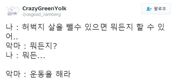 [스크랩] [유머]살만 뺄 수 있다면 뭐든지 하겠어.jpg 작성자냐옹이다|작성시간25.10.28|조회수6,444 목록 댓글 9 글자크기 작게가 글자크기 크게가 . 다음검색 스크랩 원문 : 도탁스 (DOTAX) 현재 게시글 추가 기능 열기 북마크 공유하기 신고 센터로 신고 댓글 댓글 9 댓글쓰기 답글쓰기 댓글 리스트 작성자아기비단털쥐 | 작성시간 25.10.28 악마색히👿👿 작성자뼝아리날다 | 작성시간 25.10.28 악마..이름값하네.. 작성자변치않는 믿음 | 작성시간 25.10.28 운동해라요거 쓰려고 왔는데 작성자방탄소년단지민 | 작성시간 25.10.28 썩을놈1! 작성자미루코 | 작성시간 25.10.28 운동말고... 댓글 전체보기