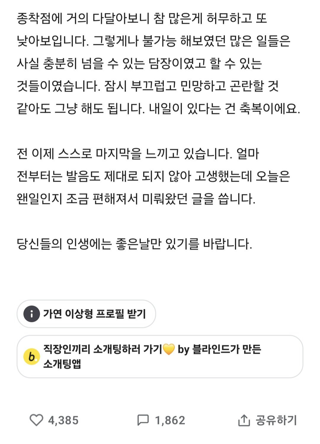 작성자초콜릿우체국 작성시간 25.10.30 ㅠㅠ 어떤 말로 위로가 될까요. 삶이 정리되는 가운데 있지만, 마음속 깊은 곳에선 생에 대한 갈망도 크실텐데 ㅠㅠ 하아... 남게되는 어머니에 대한 걱정도 ㅠㅠ