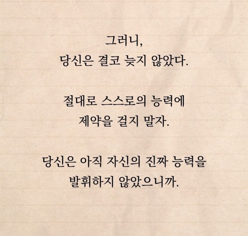 작성자meinaa 작성시간 25.11.03 나 옛날에 선생님이 이런말 해줬음. 선생님 가족들이 아이큐가 다 높고 좋은 대학 나왔는데 선생님이 어렸을때보다 지금이 이해력? 이런게 훨씬 좋아서 공부가 더 잘된다 했었어. 글 보고 나니까 스스로 느낄만큼 좋아지는 듯.
