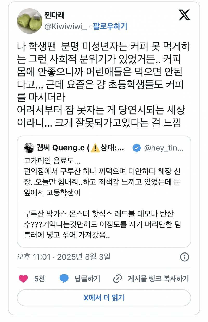 작성자후안 룰포 작성시간 25.11.27 어린 학생들이 커피와 각종 고카페인 음료를 마실 수밖에 없는 사회와 교육제도가 문제다