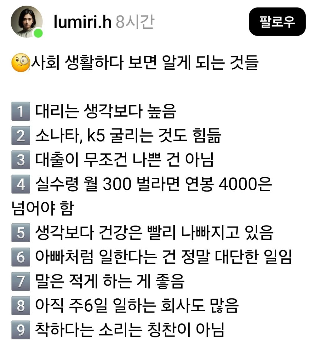 [기타]사회생활 하다 보면 알게 되는 것들 작성자전재준|작성시간25.11.27|조회수11,215 목록 댓글 4 글자크기 작게가 글자크기 크게가 엽기 혹은 진실(세상 모든 즐거움이 모이는곳)출처 : 다음검색 현재 게시글 추가 기능 열기 북마크 공유하기 신고 센터로 신고 댓글 댓글 4 댓글쓰기 답글쓰기 댓글 리스트 작성자데드풀 | 작성시간 25.11.27 ㅠㅠㅠㅠㅠㅠㅠ 작성자IlIIllll | 작성시간 25.11.27 착하다는소리 엄청들었는데 너 호구같다는 말 돌려서 한거더라 작성자초콜릿우체국 | 작성시간 25.11.27 공감.... 작성자때굴때굴 | 작성시간 25.11.27 다 맞는말이네여 공감...ㅋㅋㅋ 정년까지 직장 다니신분들 존경합니다 댓글 전체보기