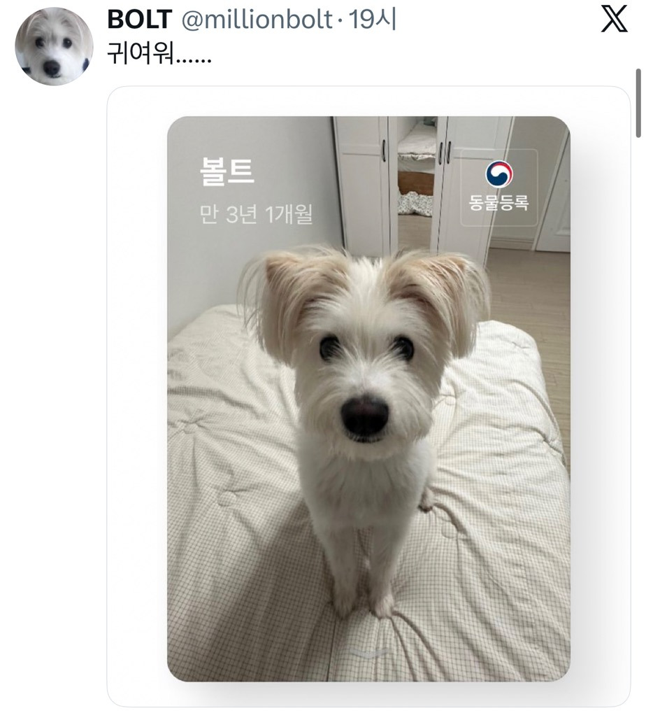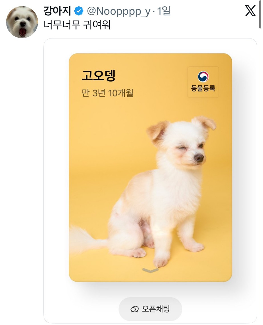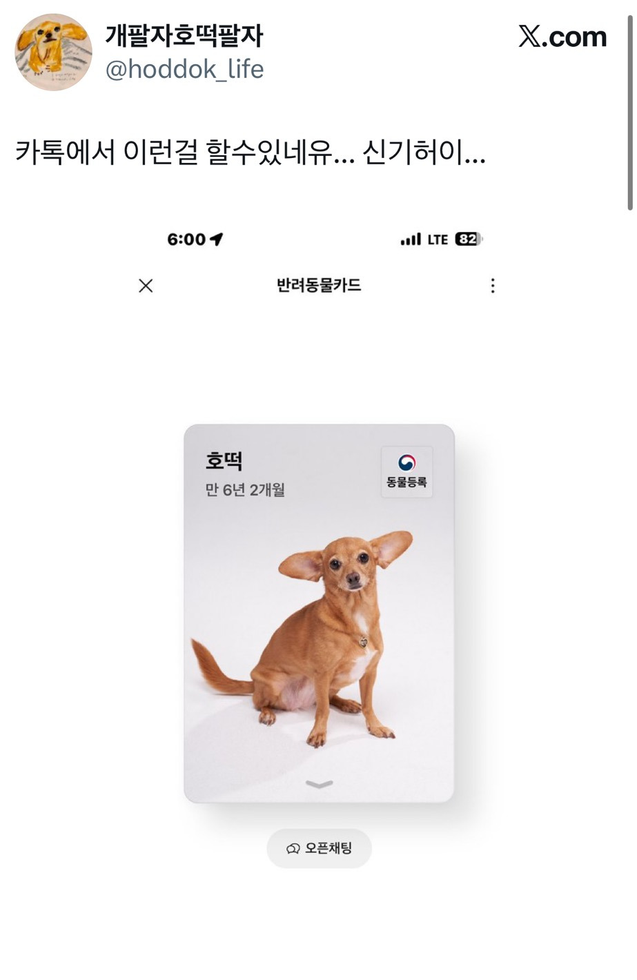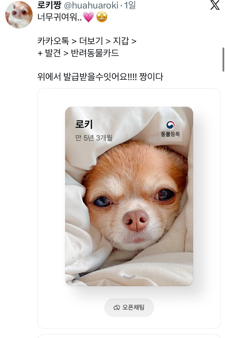 [스크랩] [기타]카카오톡 반려동물카드 작성자생강생각|작성시간25.12.02|조회수3,978 목록 댓글 9 글자크기 작게가 글자크기 크게가 출처: https://x.com/hoddok_life/status/1994749164543168727?s=46&t=KlDqBlNqBJ3fwIZTZ3FsOg 다음검색 스크랩 원문 : *여성시대* 차분한 20대들의 알흠다운 공간 현재 게시글 추가 기능 열기 북마크 공유하기 신고 센터로 신고 댓글 댓글 9 댓글쓰기 답글쓰기 댓글 리스트 작성자고양이밥 | 작성시간 25.12.02 사실상 과시네 작성자LUN8 카엘 | 작성시간 25.12.02 귀엽다ㅎㅎ 작성자아아4샷 | 작성시간 25.12.02 동물등록번호가 없어서 안만들어진다...ㅜㅜ 작성자나른고양이 | 작성시간 25.12.02 오 귀엽다 작성자뿌쁄삐언니 | 작성시간 25.12.03 오오 나도 해봐야지 ㅎㅎ 댓글 전체보기