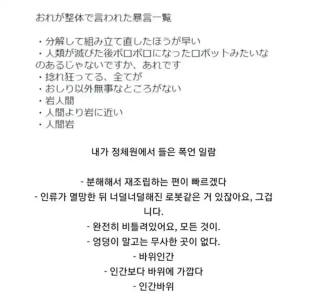 [유머]한 일본인이 안마사에게 들은 말 작성자십잡스|작성시간25.12.28|조회수6,316 목록 댓글 10 글자크기 작게가 글자크기 크게가 엽기 혹은 진실(세상 모든 즐거움이 모이는곳)출처 : 엽혹진십잡스 다음검색 현재 게시글 추가 기능 열기 북마크 공유하기 신고 센터로 신고 댓글 댓글 10 댓글쓰기 답글쓰기 댓글 리스트 작성자거대고영 | 작성시간 25.12.28 그냥 욕을 하세요 ㅜㅜ 작성자릴콜라 | 작성시간 25.12.28 차라리 때려;; 작성자빛속 | 작성시간 25.12.29 말로 패서라도 말랑말랑하게 만들고싶었던 의지.. 작성자초콜릿우체국 | 작성시간 25.12.29 저도 어깨랑 목쪽이 굳었다는 소리 ㅠㅠ 작성자법학개론 | 작성시간 26.01.04 흐미 ㅋㅋ 댓글 전체보기