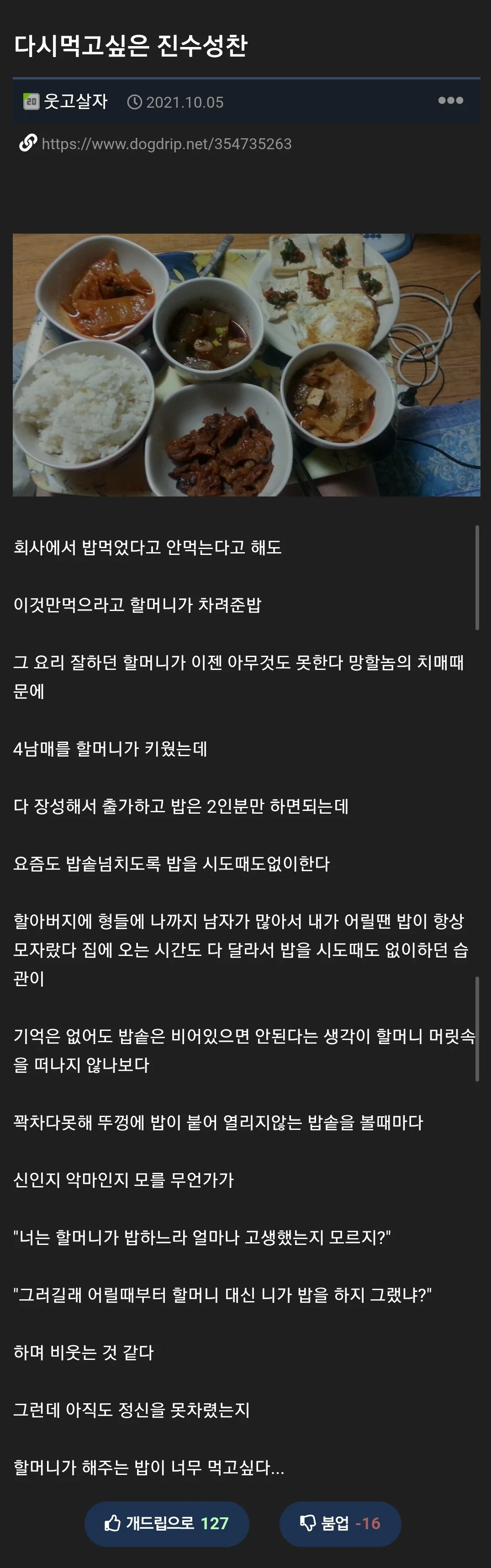 [기타]흑백요리사 안 부러운 진수성찬 작성자러바오|작성시간26.01.06|조회수7,663 목록 댓글 8 글자크기 작게가 글자크기 크게가 엽기 혹은 진실(세상 모든 즐거움이 모이는곳)출처 : 다음검색 현재 게시글 추가 기능 열기 북마크 공유하기 신고 센터로 신고 댓글 댓글 8 댓글쓰기 답글쓰기 댓글 리스트 작성자발이꽁꽁꽁꽁 | 작성시간 26.01.07 ㅠㅠㅠㅠㅠ 작성자용두사망 | 작성시간 26.01.07 ㅜㅜㅜㅜㅜㅜㅠㅜ 작성자안녕꼬마친구노디 | 작성시간 26.01.08 외할머니 보고 싶어... 작성자황초롱이 | 작성시간 26.01.08 작성자행복긍정 | 작성시간 26.01.08 눈물나.. 댓글 전체보기