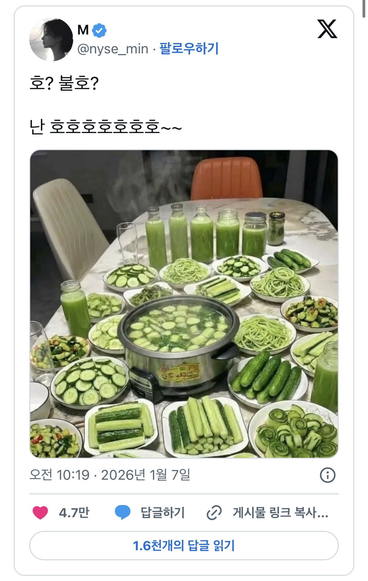[스크랩] [기타]트위터에서 논쟁중인 호불호 갈리는 밥상.jpg 작성자방탄소년단지민|작성시간26.01.08|조회수7,896 목록 댓글 27 글자크기 작게가 글자크기 크게가 출처: https://theqoo.net/square/4054289184 다음검색 스크랩 원문 : *여성시대* 차분한 20대들의 알흠다운 공간 현재 게시글 추가 기능 열기 북마크 공유하기 신고 센터로 신고 댓글 댓글 27 댓글쓰기 답글쓰기 댓글 리스트 작성자초콜릿우체국 | 작성시간 26.01.09 저한테 왜 이러세요????????????? 작성자Over The Moon | 작성시간 26.01.09 밥이 없잖아 ㅜㅜ 작성자HAYDEN KO | 작성시간 26.01.10 쌀밥에 고추장 주세요 작성자팬더사랑 | 작성시간 26.01.10 고추장 된장 쌈장 줘바 작성자추파춥춥 | 작성시간 26.01.11 다른건 괜찮은데 오이탕 제정신이시먀? 댓글 전체보기