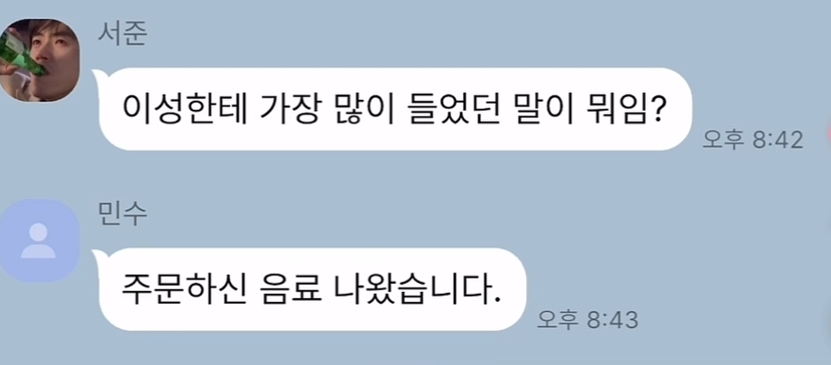 [유머]이성한테 제일 많이 들은 말이 뭐임?.jpg 작성자십잡스|작성시간26.01.13|조회수6,204 목록 댓글 10 글자크기 작게가 글자크기 크게가 엽기 혹은 진실(세상 모든 즐거움이 모이는곳)출처 : 엽혹진십잡스00번 손님 주문하신 음식나왔습니다. 다음검색 현재 게시글 추가 기능 열기 북마크 공유하기 신고 센터로 신고 댓글 댓글 10 댓글쓰기 답글쓰기 댓글 리스트 작성자밤의 리스너 | 작성시간 26.01.14 작성자님...ㅠㅠ 작성자초콜릿우체국 | 작성시간 26.01.14 진짜 인사네 ㅋㅋㅋㅋ 작성자바삭머리그녀 | 작성시간 26.01.14 고객님,. 작성자행복주의자 | 작성시간 26.01.14 아ㅋㅋㅋㅋㅋㅋㅋㅋㅋㅋㅋ 작성자파란하늘파란기분 | 작성시간 26.01.15 어서오세요 댓글 전체보기