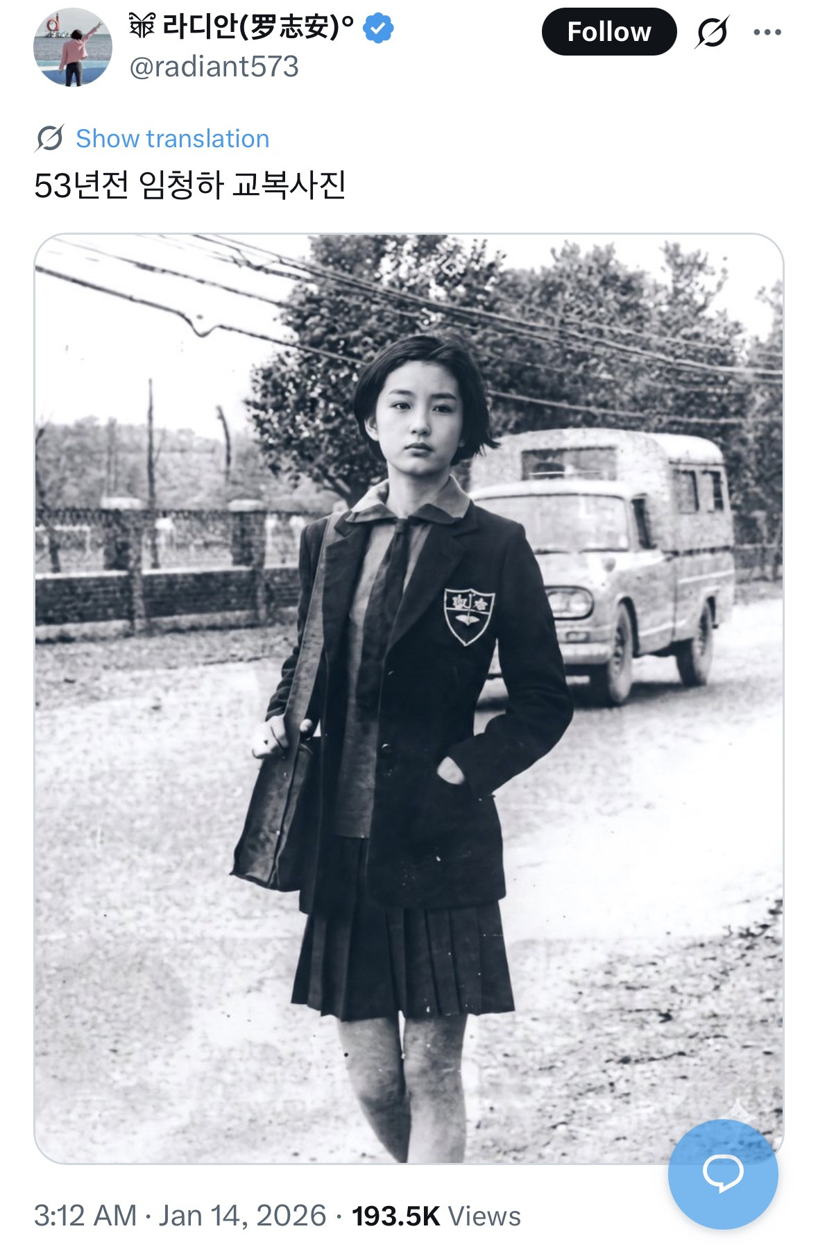 [스크랩] [유머]53년 전 임청하 교복 사진 작성자빛빔|작성시간26.01.15|조회수44,410 목록 댓글 15 글자크기 작게가 글자크기 크게가 출처: https://x.com/radiant573/status/2011395991367491706?s=20그리고 그 외 임청하 사진들 다음검색 스크랩 원문 : *여성시대* 차분한 20대들의 알흠다운 공간 현재 게시글 추가 기능 열기 북마크 공유하기 신고 센터로 신고 댓글 댓글 15 댓글쓰기 답글쓰기 댓글 리스트 작성자청춘은 바로 지금 | 작성시간 26.01.16 누군지는 모르지만 첫번째 흑백사진 대존예꾸밈 없는데 예쁨 그 자체ㅠㅠㅠ 작성자토가시요시히로 | 작성시간 26.01.17 진짜 보자마자 ‘x나이쁘네…’소리가 절로 나왔네; 작성자쿠키네크림 | 작성시간 26.01.17 와~~~~~~ 작성자내오늘안에빚갚으리오 | 작성시간 26.01.22 진짜 최고였지 청하누나 .... 작성자Ronan | 작성시간 26.01.24 백발마녀~~ 댓글 전체보기