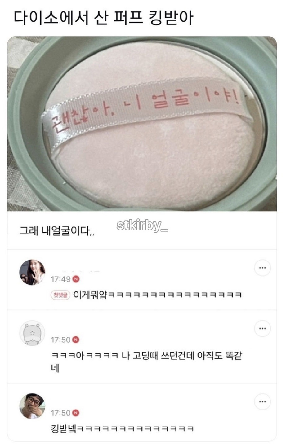[감동]킹받는 다이소 퍼프.jpg 작성자웅진 탕웨이|작성시간26.01.25|조회수6,144 목록 댓글 4 글자크기 작게가 글자크기 크게가 엽기 혹은 진실(세상 모든 즐거움이 모이는곳)출처 : 인스타그램 다음검색 현재 게시글 추가 기능 열기 북마크 공유하기 신고 센터로 신고 댓글 댓글 4 댓글쓰기 답글쓰기 댓글 리스트 작성자청춘은 바로 지금 | 작성시간 26.01.25 저게뭐야ㅋㅋㅋㅋㅋ 작성자황초롱이 | 작성시간 26.01.25 ㅋㅋㅋㅋㅋㅋㅋㅋ 작성자초콜릿우체국 | 작성시간 26.01.26 ㅋㅋㅋㅋㅋㅋㅋㅋㅋㅋㅋㅋㅋㅋㅋㅋㅋ 작성자LUN8 카엘 | 작성시간 26.01.27 댓글 전체보기