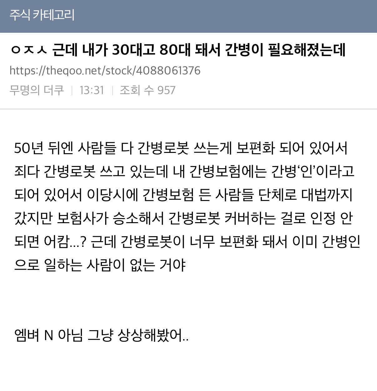 작성자뭣이라 작성시간 26.02.13 요즘 간병 통합 병원도 많아지고 있어서 좋더라. 그리고 로봇이든 아니든 간병인 보험이 아니고 간병 보험이라서 간병하는데 들어가는 비용은 다 보장하는 보험이지 않을까?