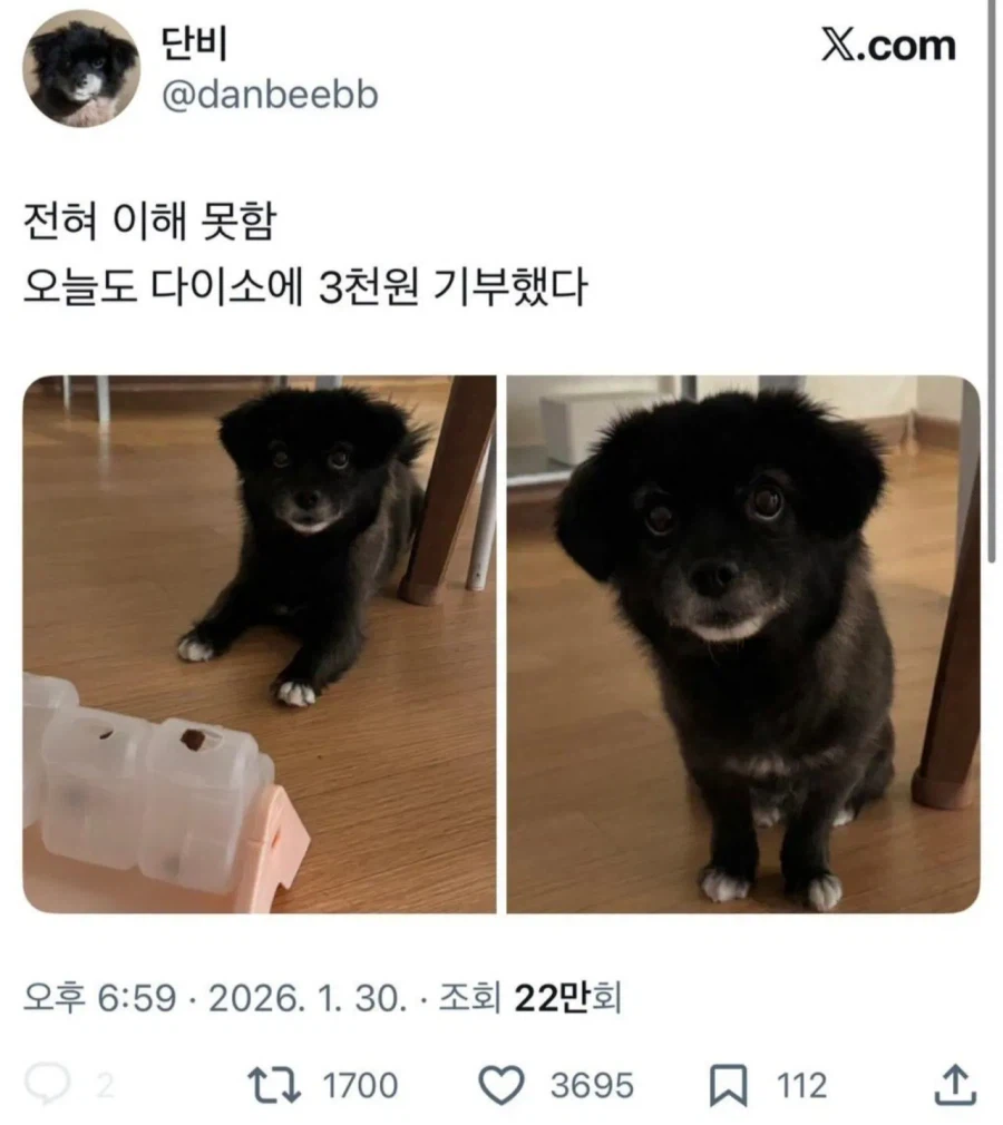 [스크랩] [동물]오늘도 다이소에 3천원 기부했다 작성자러바오|작성시간26.02.10|조회수4,369 목록 댓글 9 글자크기 작게가 글자크기 크게가 급식기ㅋㅋㅋhttps://x.com/haemttasjwi/status/2017255884691550209X의 햄땃쥐님(@haemttasjwi)RT @danbeebb: 전혀 이해 못함 오늘도 다이소에 3천원 기부했다x.com 다음검색 스크랩 원문 : 樂soccer 현재 게시글 추가 기능 열기 북마크 공유하기 신고 센터로 신고 댓글 댓글 9 댓글쓰기 답글쓰기 댓글 리스트 작성자음~이러는거 아니야~ | 작성시간 26.02.12 저 정도 귀여움이면 엄마가 갖고 노는 게 맞다 작성자鹵유빈卍쉐ㆀ | 작성시간 26.02.12 ㅋㅋㅋㅋㅋㅋㅋㅋㅋㅋㅋㅋㅋㅋㅋㅋㅋㅋㅋㅋㅋㅋㅋㅋㅋ 인슷하에서 자주보던 강아지넹 작성자스템온 | 작성시간 26.02.12 ㅌㅌ 작성자내이름은코난학생이죠 | 작성시간 26.02.16 ㅋㅋㅋㅋㅋㅋㅋㅋㅋㅋㅋㅋㅋ 작성자경기도민 | 작성시간 26.02.26 ㅋㅋㅋㅋ너무 이뻐서 넋놓고 봄 댓글 전체보기