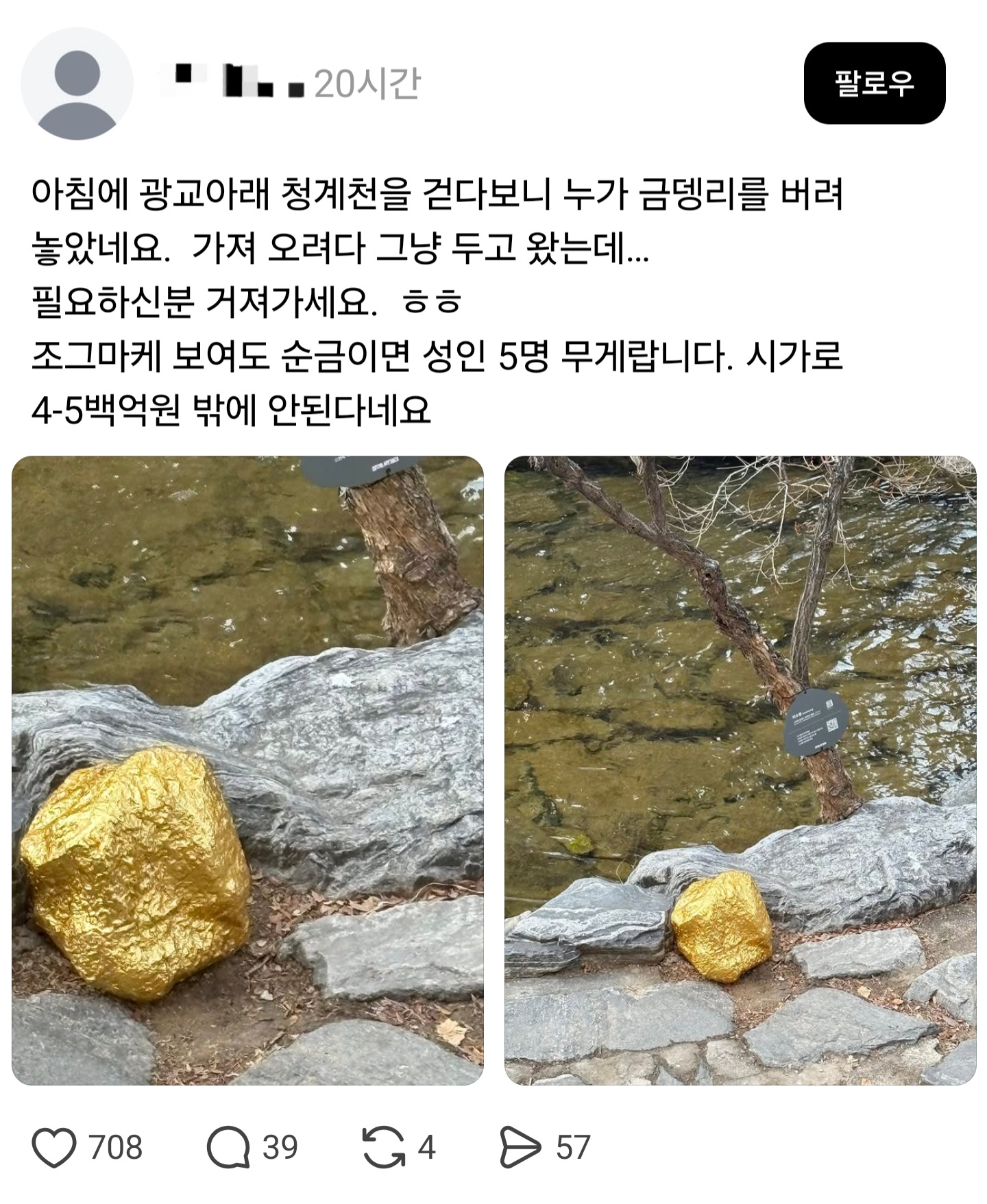 [기타]청계천 걷다가 금덩이를 발견한 사람 작성자버드와이저|작성시간26.02.13|조회수223,241 목록 댓글 8 글자크기 작게가 글자크기 크게가 엽기 혹은 진실(세상 모든 즐거움이 모이는곳)출처 : 스레드 요새 금값 슬슬 떨어지고 있던데 고민되네 🤔 다음검색 현재 게시글 추가 기능 열기 북마크 공유하기 신고 센터로 신고 댓글 댓글 8 댓글쓰기 답글쓰기 댓글 리스트 작성자초콜릿우체국 | 작성시간 26.02.13 가져가서 금니 하세요 작성자INTJ | 작성시간 26.02.13 금뎅리가 뭐래 작성자재-쥬래갠 | 작성시간 26.02.13 600억만 돼도 갈랬는데 에이 안되겠다 작성자☆당신의 눈동자를 쑤셔~건배★ | 작성시간 26.02.13 금덩이 가져오다 내가 돌에 깔릴듯... 작성자영원 | 작성시간 26.02.23 비슷하게 보임 댓글 전체보기