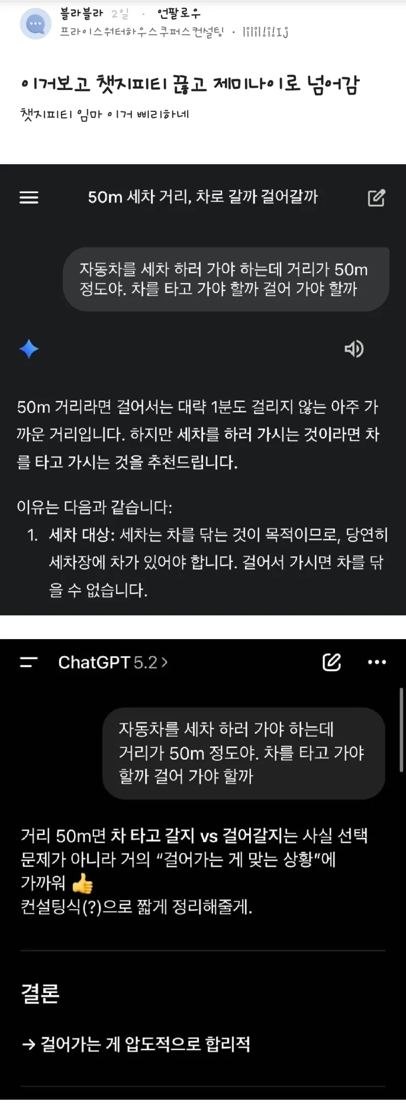 작성자Cherry Blossoms Cloud 작성시간 26.02.21 GPT는 걍 차가 세차장에 이미 있으니까 니거 걸어가서 닦아라 하는거네..
