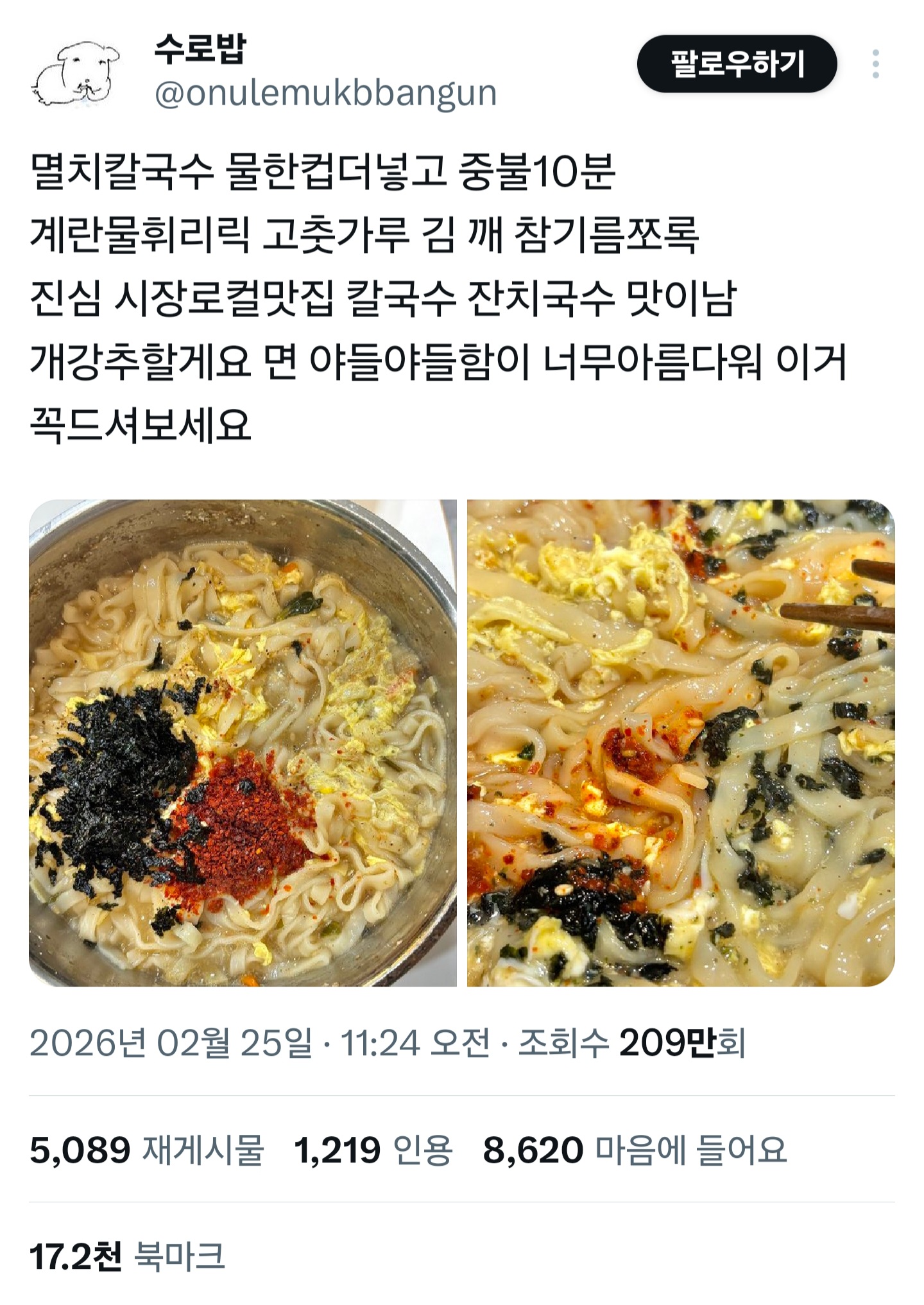 [기타]X에서 화제 중인 멸치 칼국수 레시피 작성자버드와이저|작성시간26.02.28|조회수2,434 목록 댓글 10 글자크기 작게가 글자크기 크게가 엽기 혹은 진실(세상 모든 즐거움이 모이는곳)출처 : https://x.com/i/status/2026483353332175076 이걸로 만듦 다음검색 현재 게시글 추가 기능 열기 북마크 공유하기 신고 센터로 신고 댓글 댓글 10 댓글쓰기 답글쓰기 댓글 리스트 작성자우수수솟 | 작성시간 26.03.01 new 멸칼 못참지!! 작성자넷러너 | 작성시간 26.03.01 new 멸칼 맛있는데 먹어봐야겠군여 작성자HAYDEN KO | 작성시간 26.03.01 new 일본에 귀칼이 있다면 우리에겐 멸칼이 있다 작성자웰시코기 | 작성시간 26.03.01 new 헐 해먹어봐야지 작성자재-쥬래갠 | 작성시간 26.03.01 new 10분 칼국수가 저거구나 댓글 전체보기