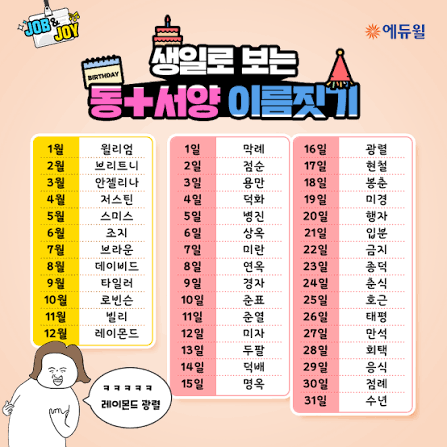 [사진]나의 생일로 동+서양식 이름을 지어보자,jpg 작성자초아요♥|작성시간26.03.05|조회수4,005 목록 댓글 28 글자크기 작게가 글자크기 크게가 엽기 혹은 진실(세상 모든 즐거움이 모이는곳)출처 : 에듀윌 다음검색 현재 게시글 추가 기능 열기 북마크 공유하기 신고 센터로 신고 댓글 댓글 28 댓글쓰기 답글쓰기 댓글 리스트 작성자바보들ㅋ바보들ㅋㅋ | 작성시간 26.03.06 윌리엄 봉춘;;; 작성자우즈 | 작성시간 26.03.06 스미스 점순... 작성자이눔짜샤 | 작성시간 26.03.07 안젤리나 점례 작성자이재(怡栽) | 작성시간 26.03.07 안젤리나 춘표 ㅋㅋㅋ 작성자남준석진윤기호석지민태형정국 | 작성시간 26.03.07 조지부터 맘에 안들어 댓글 전체보기