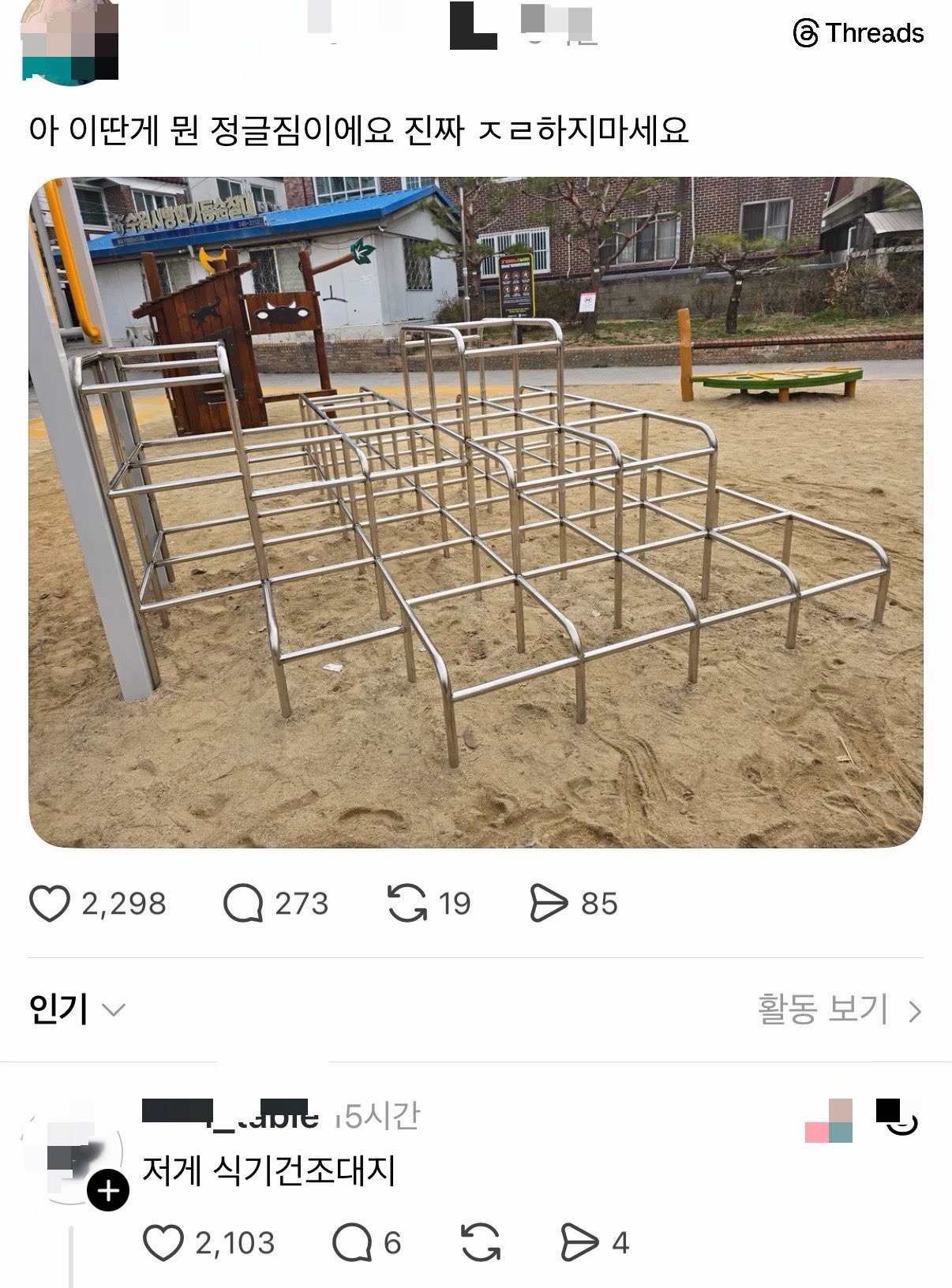 [스크랩] [기타]요즘것들 ...정글짐 논란....jpg 작성자식빵|작성시간26.03.25|조회수6,457 목록 댓글 19 글자크기 작게가 글자크기 크게가 출처: https://theqoo.net/square/4138263038너무 나약해서 논란 다음검색 스크랩 원문 : *여성시대* 차분한 20대들의 알흠다운 공간 현재 게시글 추가 기능 열기 북마크 공유하기 신고 센터로 신고 댓글 댓글 19 댓글쓰기 답글쓰기 댓글 리스트 작성자프로방해꾼 | 작성시간 26.03.25 new 떨어졋을때 팔하나쯤은 부러져야 정글짐 이지!! 작성자승희님 | 작성시간 26.03.25 new 다들 정글짐에서 자기 뼈 한 번씩 보고 그르자나여?? 작성자무한하게빛나는버퐐로 | 작성시간 26.03.25 new 나약하군 작성자청춘은 바로 지금 | 작성시간 26.03.25 new 빨래건조대 아니냐고; 개노잼으로 생겼네 작성자라면땅모모 | 작성시간 26.03.25 new 식기건조대ㅋㅋㅋㅋㅋㅋㅋㅋㅋㅋㅋㅋ 댓글 전체보기