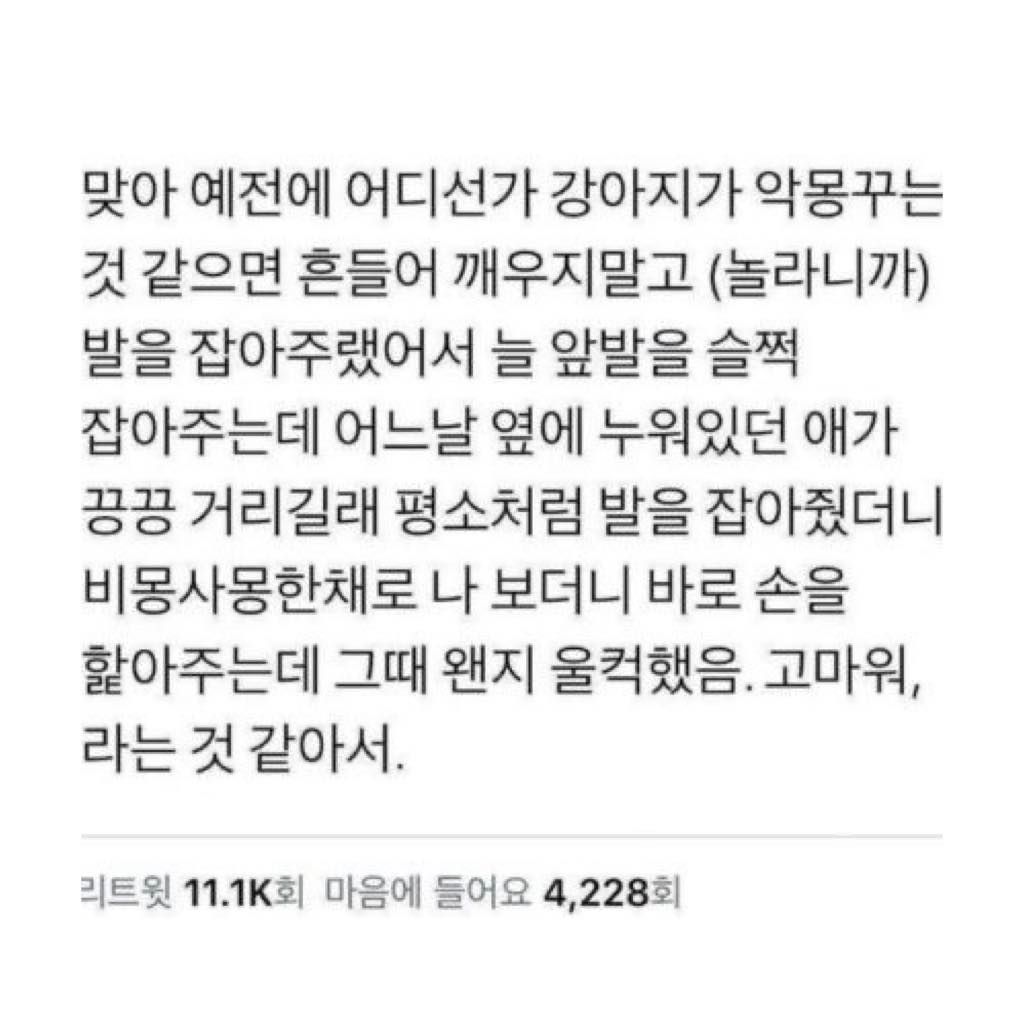 보호소 봉사 갔을때 마취 덜깬 개가 비틀거리면서 나한테 오려는거 보고 맴찢이었음 난 주인도 아닌데 사람이라는 이유로 그렇게도 좋을까 ㅜㅜ